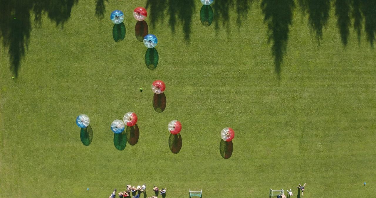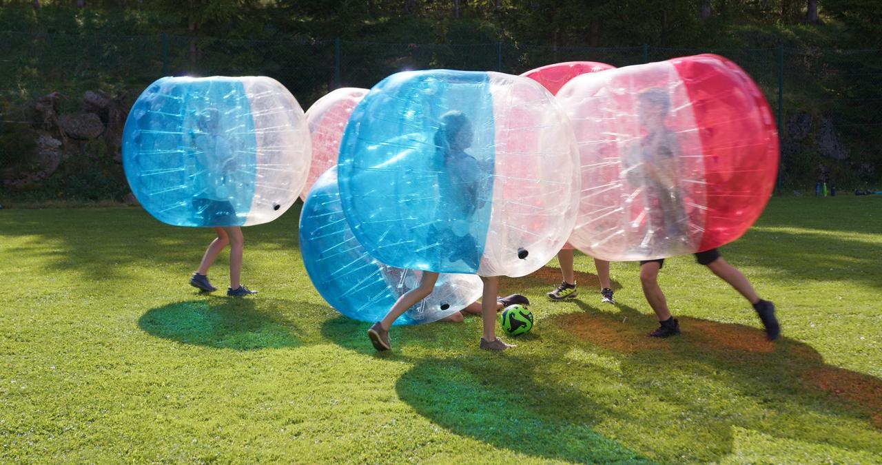 Rein in die riesige Bubble, losrollen, lachen und Tore schießen! Beim Bubble Soccer stecken Kinder in großen, weichen mit Luft gefüllten Bubbles und spielen Fußball, nur einfach mal ganz anders. Bei diesem halbtägigen Angebot sind zusammenstoßen, kugeln und lachen ausdrücklich erlaubt.